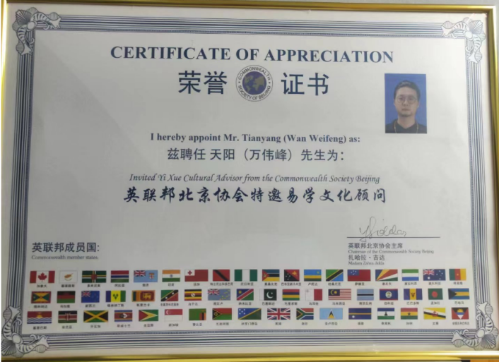 英联邦北京协会授予天阳老师“特邀易学文化顾问”荣誉称号发表时间:2023-11-20 15:56 引言 在传统文化与现代社会的桥梁上,天阳老师以其卓越的国学文化教育贡献获得了英联邦北京协会的高度认可,被授予“特邀易学文化顾问”的荣誉称号。这一事件不仅是对天阳老师个人成就的肯定,更是对中国传统文化国际影响力的一次显著提升。 天阳老师的国学背景 作为国学文化的资深教育家,天阳老师对《易经》等中国古代典籍有着深入的研究和独到的见解。多年来,他致力于易学的普及和传播,通过各种渠道将这门古老智慧传递给现代社会,特别是年轻一代。他的教学理念不仅局限于学术领域,更注重将古代智慧应用于现代生活实践。