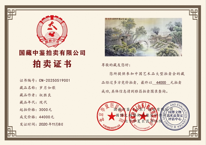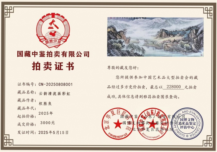国藏中鉴山东拍卖有限公司.国博文物艺术品鉴定评估中心.北京华夏巨匠书画院.2025年5月11日邀约著名书画家权胜良送拍一幅山水画作品.云韵清流画彩虹.拍卖成交228000,此善款捐赠贵州省榕江县2025年6月份这次特大洪水灾区,组委会灾区人民像著名书画家权胜良大爱之情表示感谢...!